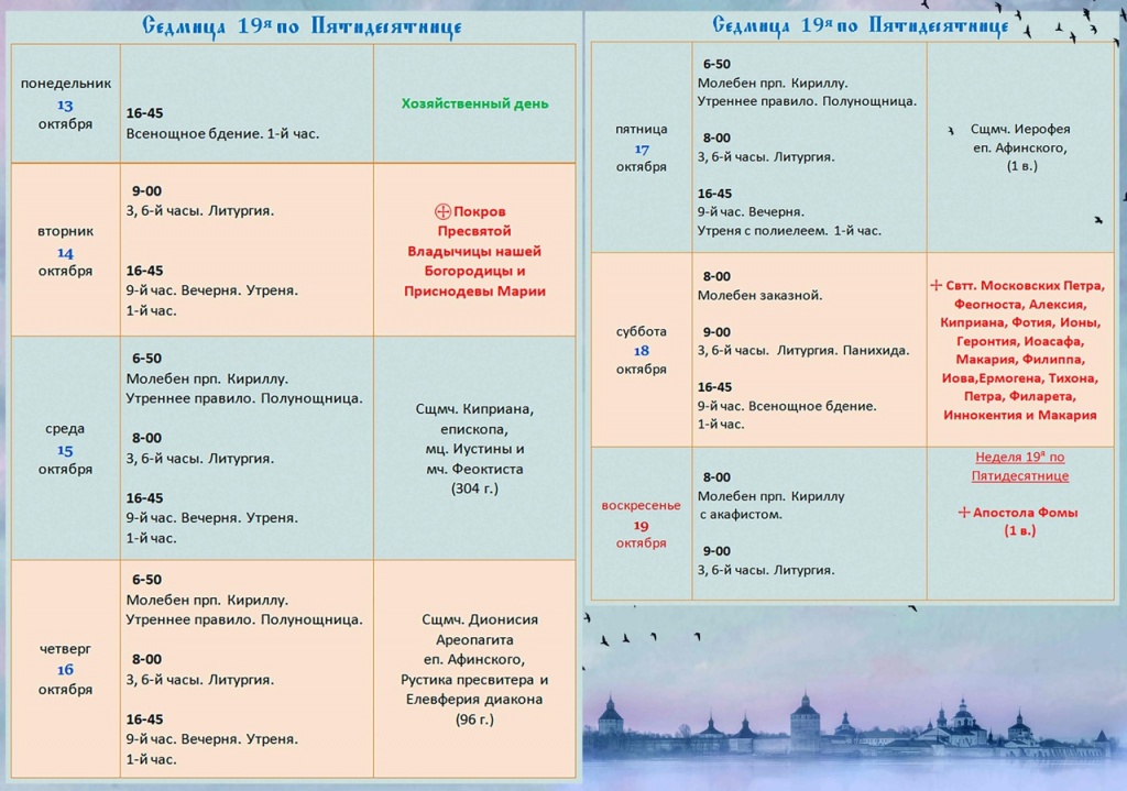 Расписание богослужений в Кирилло-Белозерском монастыре с 13 по 19 октября
