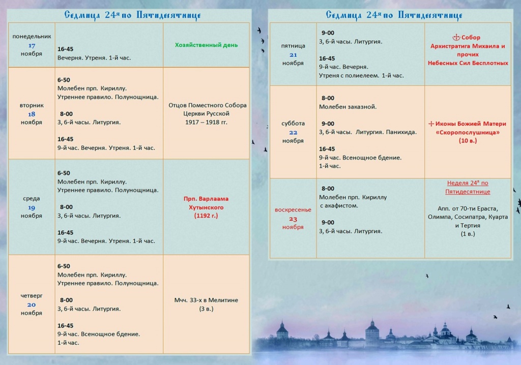 Расписание богослужений в Кирилло-Белозерском монастыре с 17 по 23 ноября