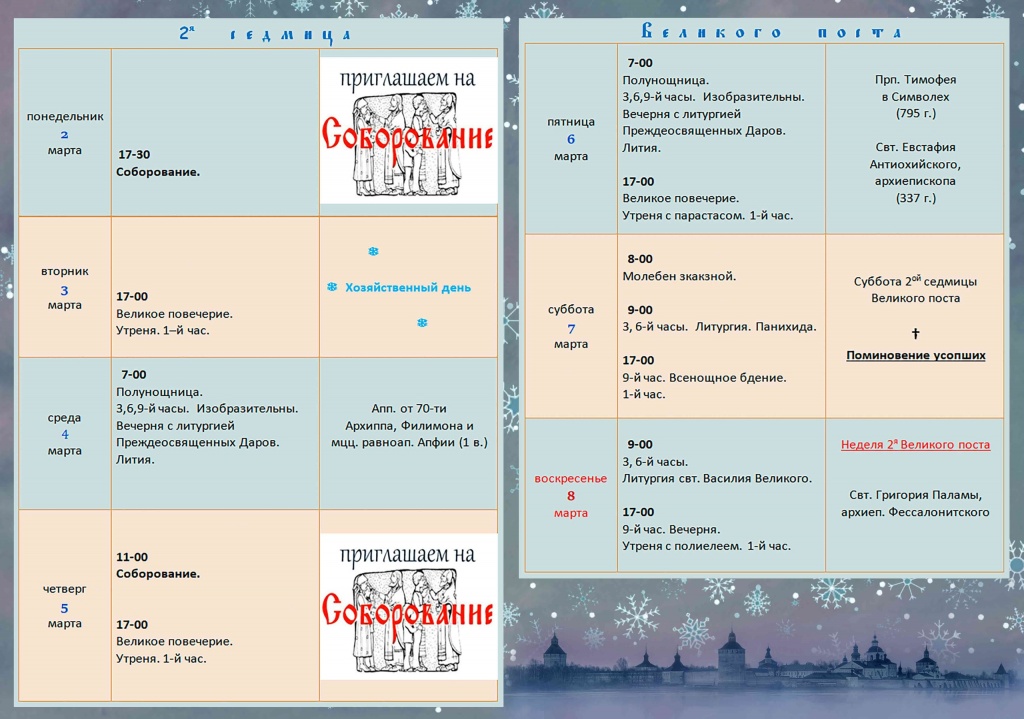 Расписание богослужений в Кирилло-Белозерском монастыре с 2 по 8 марта