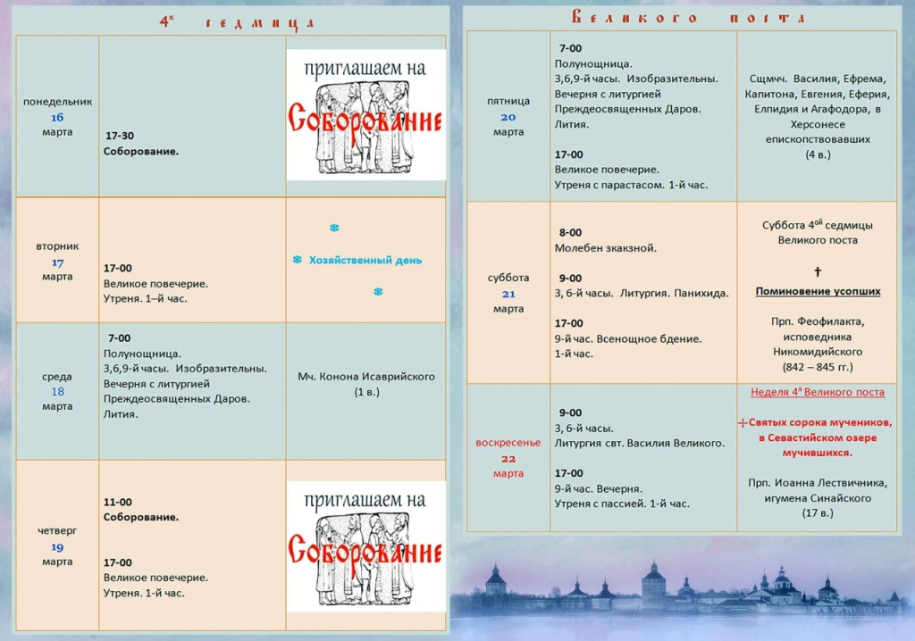Расписание богослужений в Кирилло-Белозерском монастыре с 16 по 22 марта